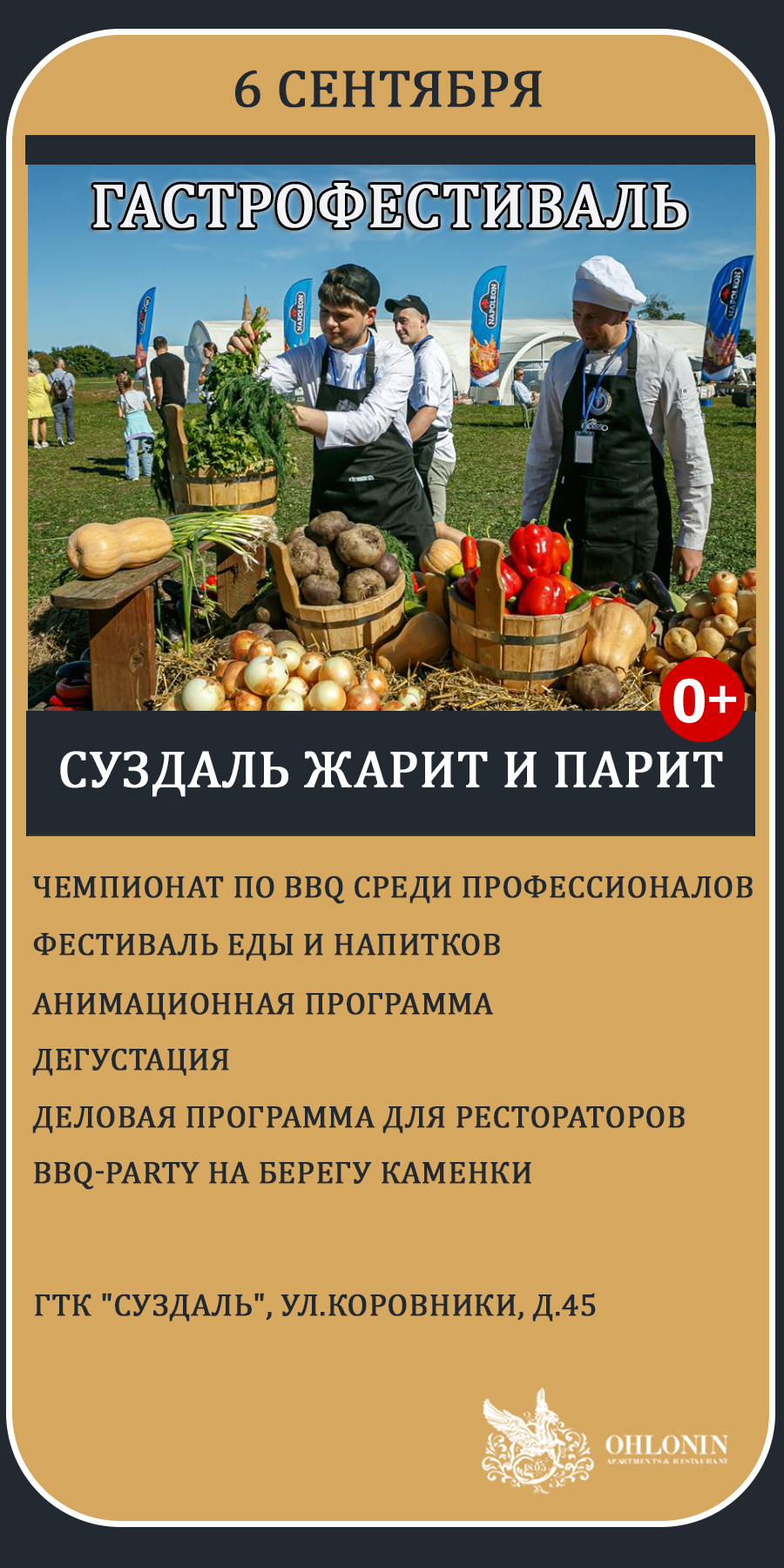 Кулинарные поединки команд шеф-поваров, чемпионат по барбекю, дегустация, фудкорт, мастер-классы, анимации и вечеринка на берегу Каменки с выступлением известной cover-группы